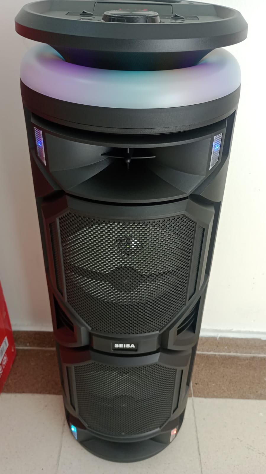 La cabina recargable SEISA YX-H8269 ofrece un sonido potente con dos parlantes de 8”, micrófono inalámbrico incluido y luces LED dinámicas que crean el ambiente perfecto. Ideal para reuniones, eventos, karaoke o disfrutar de tu música favorita en casa.