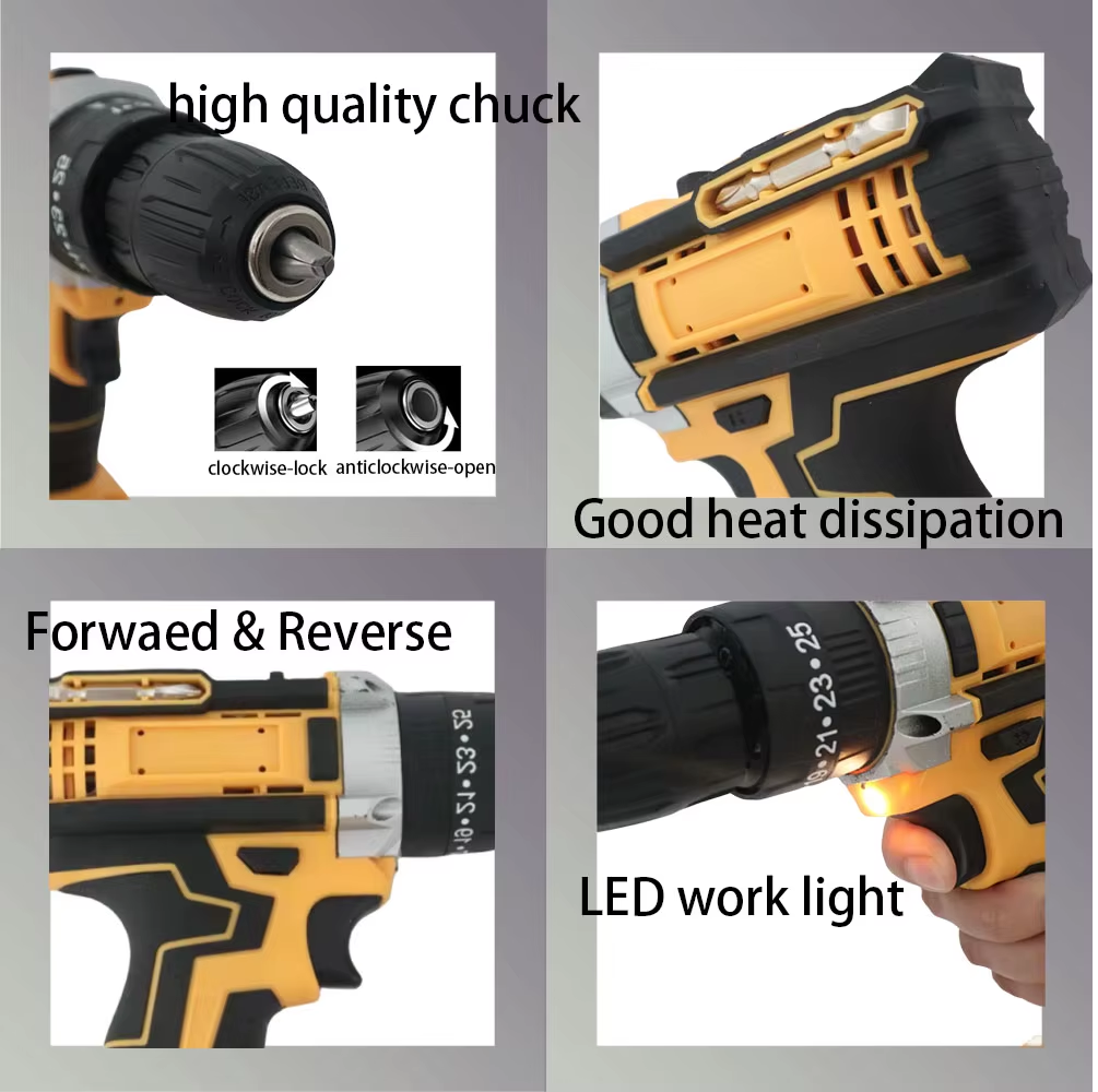 ¡El compañero ideal para tus proyectos en casa o en el trabajo! Este taladro inalámbrico de 48V está diseñado para tareas pesadas gracias a su potente función percutora , mandril metálico, 2 baterías de litio de larga duración y un completo kit de herramientas .