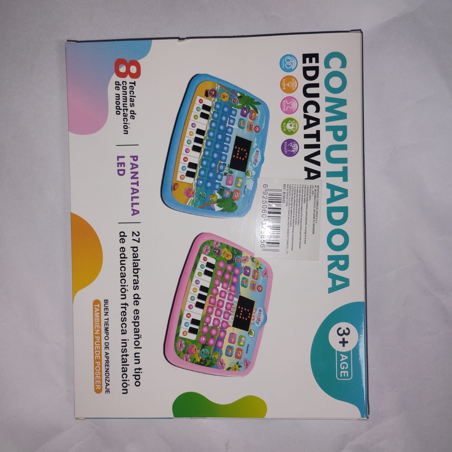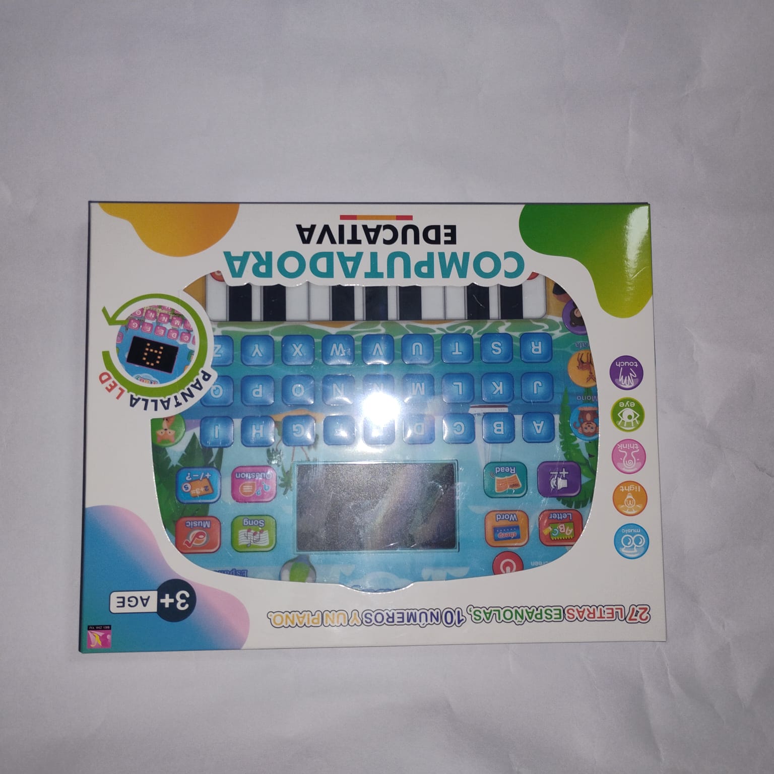 Este dispositivo combina sonidos, música, luces LED y actividades interactivas para que los pequeños aprendan letras, números, sumas, restas, animales y más, mientras se divierten.